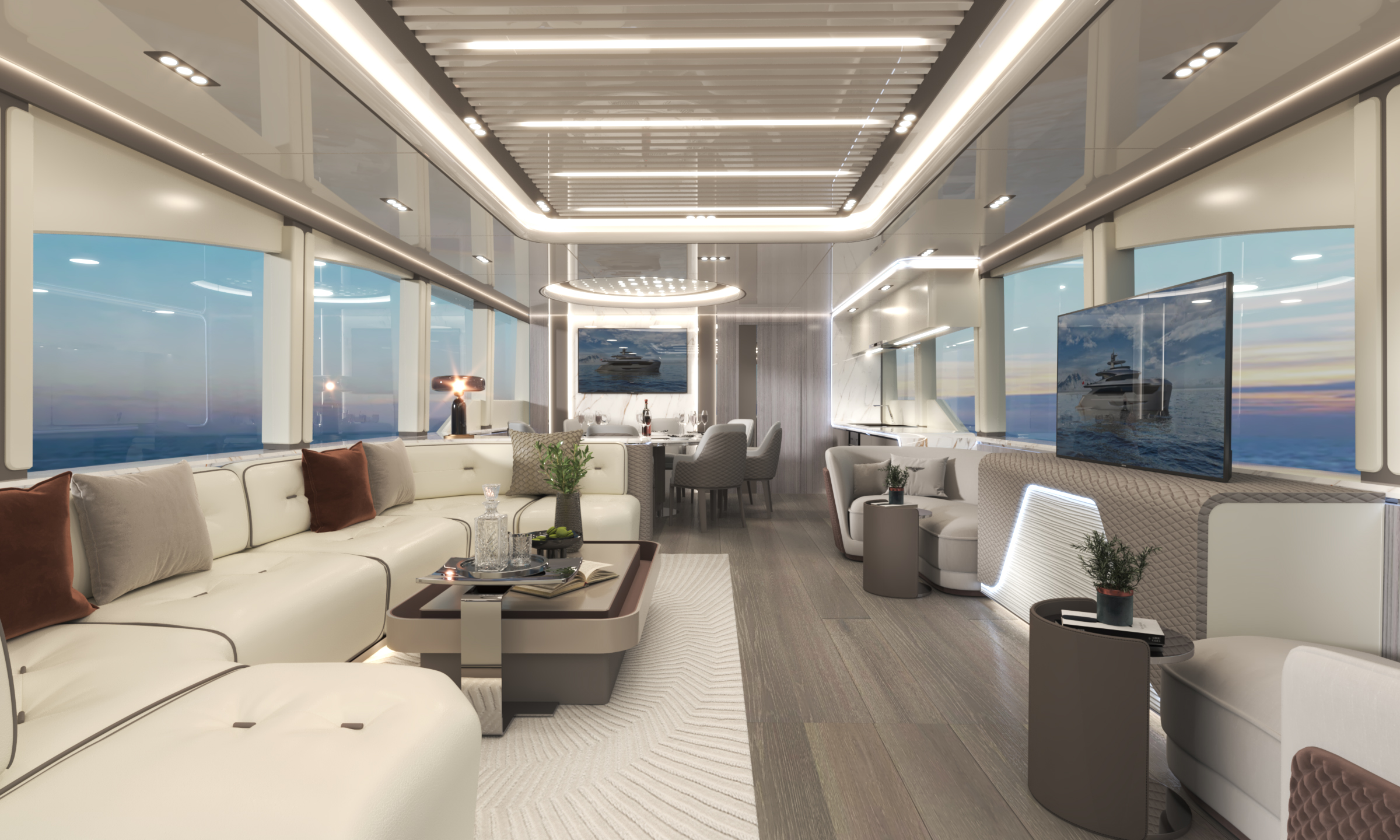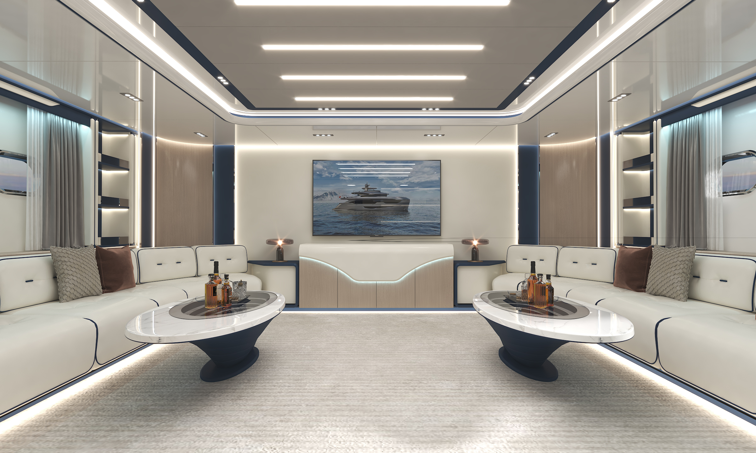 定制化的豪華商務(wù)沙龍廳,奢華與舒適的氛圍彌漫每一寸空間。細(xì)膩的皮革沙發(fā)、精致的木質(zhì)裝飾板以及柔和的燈光相互映襯,營造出溫馨而高雅的環(huán)境。巨大的窗戶將窗外的海景盡收眼底,藍(lán)色的海洋一望無際,海浪輕輕拍打著游艇,讓人在商務(wù)交流之余,也能盡情享受大自然的美妙。